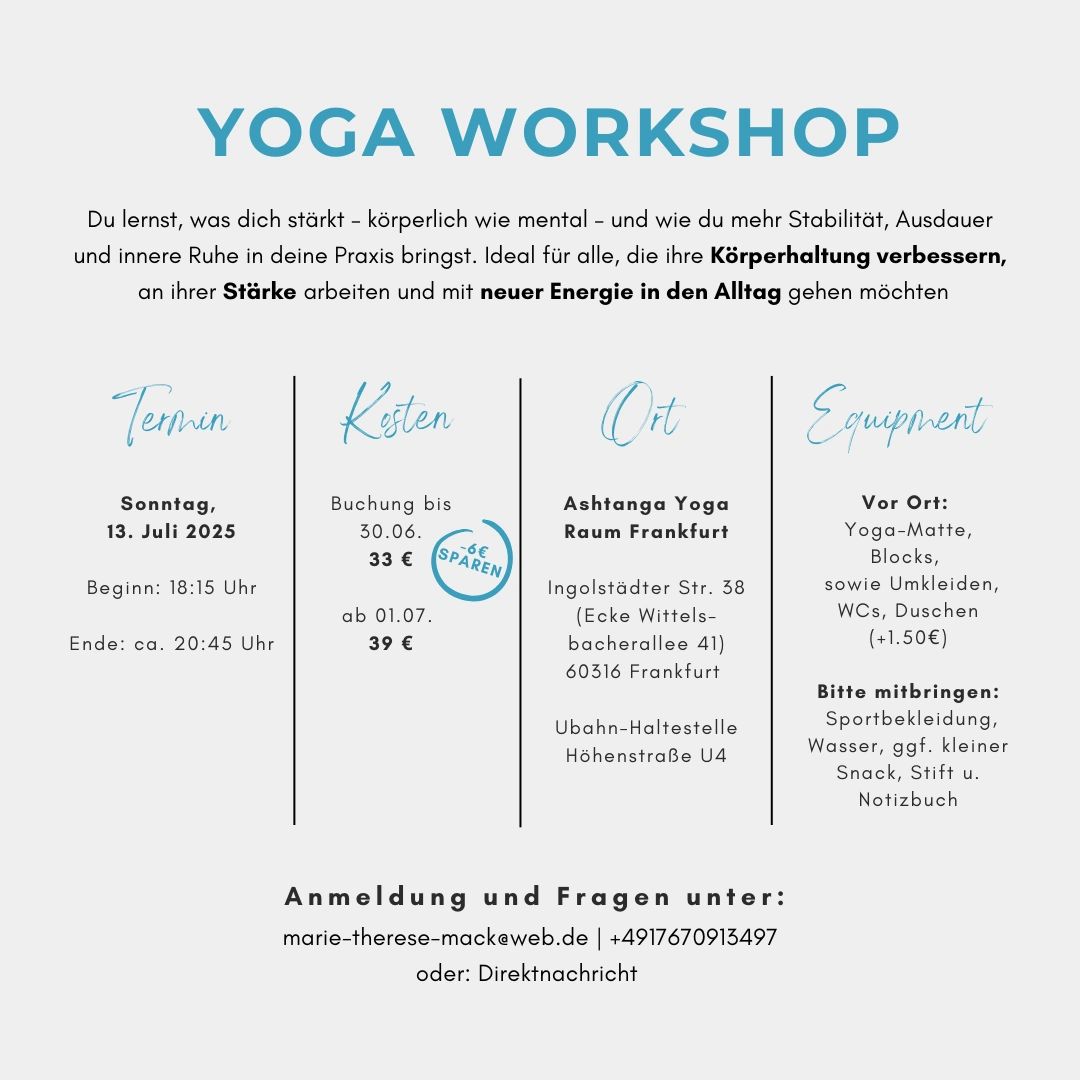 In Frankfurt entdeckte ich durch enge Freundinnen meine Leidenschaft für Yoga. Als frühere Tänzerin fand ich im Yoga vertraute Elemente wie Körperspannung und -kräftigung, Musik sowie körperliches Wohlbefinden wieder. Besonders der meditative Aspekt des Yoga verleiht mir mentale Kraft, Entspannung und hilft mir, mich zu fokussieren und Klarheit zu gewinnen.